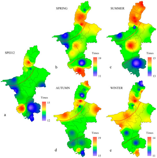 Spatial distribution of drought occurrence times based on SPEI12 and SPEI3 values during 1960–2016. (a) The SPEI12 values were used to calculate the interannual average values; (b–e) the SPEI3 values were used to calculate the interannual average values in each season.