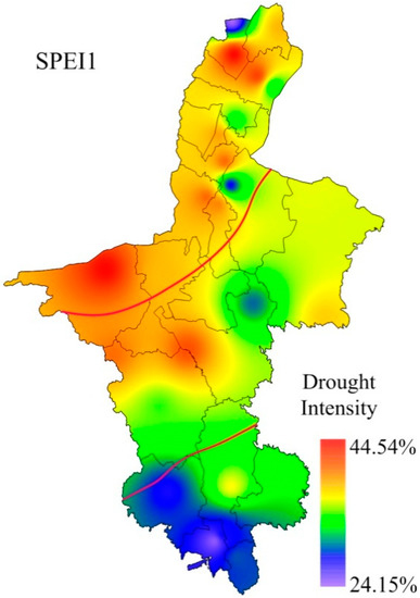 where is the numbers of M; is the SPEI value of the jth drought site in the ith year. The average SPEI1 value of M is the SPEI value of the drought process. Then, the drought intensity of each site is calculated according to formula (3), and the drought intensity spatial analysis is performed using its standardized numerical percentages.