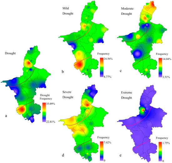Spatial distribution of drought frequency in different degrees between 1960 and 2016 (the drought frequency was calculated by the SPEI12 values). (a) The frequency of the drought; (b–e) The frequency of mild, moderate, severe, and extreme droughts.