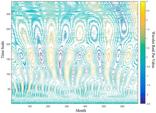 The wavelet transform decomposes the time series into time and frequency domains in order to obtain a significant fluctuation pattern of the time series (that is, a period and a time change pattern of the period). The wavelet transform is divided into Continuous Wavelet Transform (CWT) and Discrete Wavelet Transform (DWT). The latter is a compact representation of data and is commonly used in noise reduction and data compression processing [56,57]. In this study, CWT, , is the basis for wavelet analysis, which could be defined as the convolution of the data with a translated and scaled version of the wavelet function, which is localized in both the frequency and time with a zero mean [56,58].