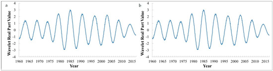 Based on the results of the wavelet variance test, the wavelet coefficient time–frequency plots corresponding to the scales were plotted for the first and the second major periods (Figure 14). The average period of the time series and variation trends of the drought severity at different timescales were analyzed. The real part value of the wavelet coefficient >0 represents serious droughts, while the real part value <0 represents lighter droughts. On the first main cycle (13.3 years, Figure 14a), there were approximately 6.5 drought changes, with an average period of 4.4 years. On the second main cycle (8.75 years, Figure 14b), about 10 cycles of change, with an average period of 6.5 years, were undergone. All of these results are consistent with those from the previous analyses.