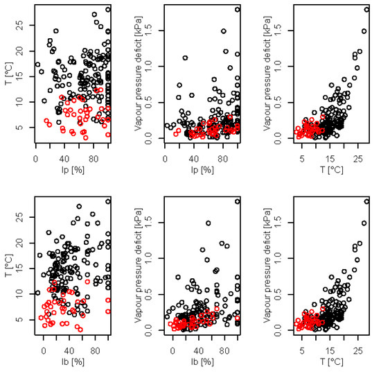 Figure 2 shows the relationship between air temperature, vapour pressure deficit and interception loss for birch (Ib) and pine (Ip) trees for the 175 events that were analysed in this study. Events measured in the leafless and leafed period are indicated with red and black colour, respectively. About 20% of all considered events were measured in the leafless period, and 80% in the leafed period. The correlation between Ib and T, and Ip and T, is similar for the leafless and leafed periods. On the other hand, the correlation between Ib and VPD, and Ip and VPD, is higher for events measured in the leafless period than for events measured in the leafed period (Figure 2). Furthermore, correlation between T and VPD was higher during the events that were measured in the leafed period compared to the events measured in the leafless period (Figure 2).
