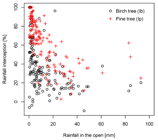 From three and a half years of measurements, we selected 175 rainfall events with complete data for further analysis. The total rainfall amount for these events was 2049 mm and average intensity was 2.0 mm/h (±2.4 mm/h). The largest event in terms of rainfall amount was detected between 14 and 15 June 2016, with a total rainfall amount of 93 mm and a duration of 21.5 h. Table 2 shows the descriptive statistics for the analyzed variables used in this study. On average, birch trees intercepted 40% (±27%) of rainfall per event (Table 2). The interception loss was equal to 100% for 12 events with less than 1.4 mm of rainfall in the open (Figure 3). This was expected, since for the events with a rainfall amount smaller than the canopy storage capacity (1.1–3.5 mm for birch trees), the total rainfall amount is intercepted [14]. Furthermore, for three events, throughfall under birch trees exceeded the amount of rainfall in the open, which resulted in negative values of rainfall interception (Table 2). This phenomenon is usually attributed to so called “drip points”, where rain drops concentrate at the edge of the canopy e.g., [4,65]. Pine trees intercepted on average 68% (±25%) of rainfall per event (Table 2). The entire rainfall amount in the open was intercepted during 29 events with less than 2.6 mm of rainfall (canopy storage capacity for pine trees varied between 0.9 and 2.9 mm) (Figure 3). In total, birch trees intercepted 484.8 mm of rainfall (24%) and pine trees intercepted 926.5 mm of rainfall (45%). Compared to similar deciduous trees, the rainfall interception of birch trees was in the range of 20% and 29% of rainfall measured in oak and birch deciduous forest in the UK [92], 25% and 28% measured in mixed Mediterranean deciduous forest in Slovenia [4] and between 16% and 25% measured in a temperate deciduous forest in Maryland, USA [93]. Interception losses by pine trees in the present study are similar to 41% of gross precipitation measured in mature coniferous forest in British Columbia, Canada [94], 52% rainfall intercepted by Douglas-fir and 61% intercepted by western red cedar in an urban area of North Vancouver, Canada [95].