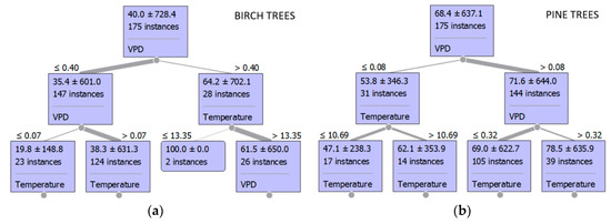 Decision trees for rainfall interception by birch (a) and pine (b) trees; only the first three levels are presented. Values shown in boxes indicate mean and variance of instances related to this specific node. Numbers written outside boxes indicate values that are used to divide different nodes.