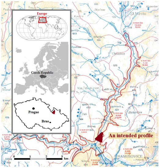 The case study is based on the intended profile in Hanusovice in the Czech Republic, 200 km east of the capital city Prague, see Figure 1. The new dam is planned in the Morava River Basin, maintained by the manager of the Morava River Basin, State Enterprise (PMO), and the Krupa River is the main inflow into the reservoir. The long-term mean river flow Qa is 2.12 m3 s−1. The elevation volume and area curves for a given profile were determined by a digital terrain model using GIS software. In this software, Figure 1 has been also generated showing one of the possible new dam locations.