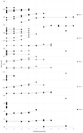 The obtained relation between resilience and NPV in the form of Pareto sets is in Figure 3. For each dam height, 15 climate scenarios from 2015 to 2100 were used from [63] for the planned profile.