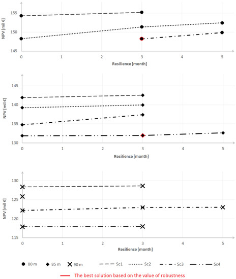 In Table 2 we can see, if the decision variables for the less water scenarios (Sc3 and Sc4) are selected, than robustness for given solutions will be higher, because decision variables (QEXC) were lower than decision variables from the more water scenarios. According to Table 2, it is obvious that one of the best results is for the decision variables in Sc3, resilience RES ≤ 3 months, robustness ROB ≥ 80.0%, and then the dam height is 80.0 m. The average NPV is 147.8 mil. €, the cost of the construction of dam is 91.05 mil. €, and the benefits from the hydropower and water supply are on average 238.8 mil. €. The active storage capacity VA is 34.48 mil. m3 and total volume of the dam is 42.63 mil. m3.