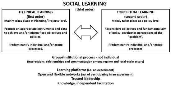 - Social learning (third-order) providing the opportunity and leverage to promote regular shifts (transformation) in the sophistication of learning, from technical to conceptual. Indeed, it is suggested that without ‘social learning’, conceptual shifts in understanding will only occur following a crisis or persistent policy failure [42].
