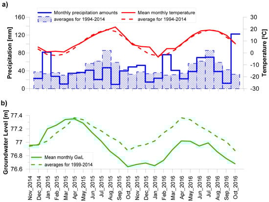 Monthly precipitation amounts, monthly mean temperature (a) and ground water level (b) during the study period along with averages from the years 1994 to 2014—precipitation and temperature, and 1999 to 2016—ground water level, respectively.