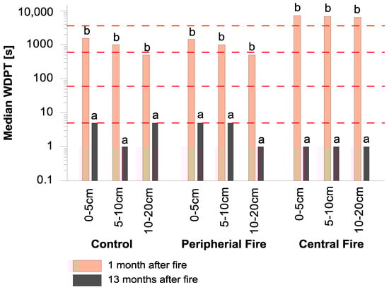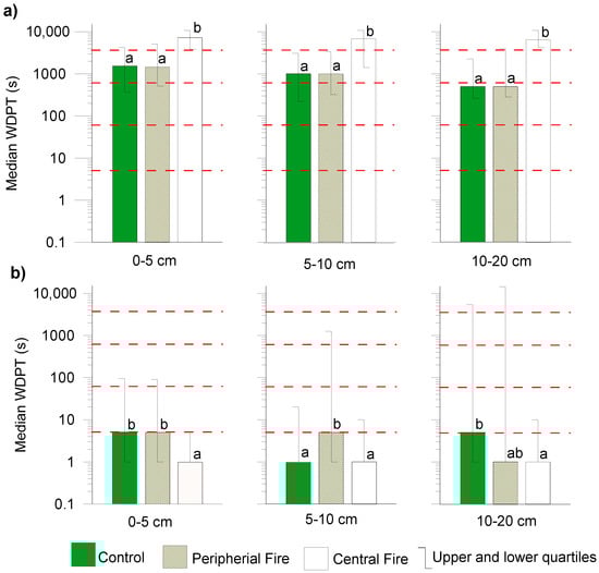 Median Water Drop Penetration Time (WDPT) with upper and lower quartiles on the control site, and in the areas of a peripheral fire and central fire in three soil depths (a) 1 month after a fire; (b) 13 months after a fire. Note: Different letters denote significant differences in each depth, as determined with the Kruskal-Wallis test (α < 0.05). SWR classes (red dashed lines), (0) wettable or non-water repellent, WDPT < 5 s; (1) slightly repellent, from 5s WDPT ≤ 60 s; (2) strongly repellent, from 60s WDPT ≤ 600 s; (3) severely repellent, from 600s WDPT ≤ 3600 s; and (4) extremely repellent, WDPT > 3600 s.