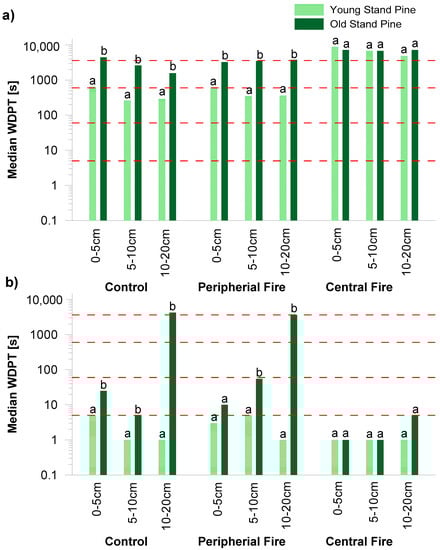 Median WDPT values for soil under a young and old pine stand for 0–5 cm, 5–10 cm, and 10–20 cm soil samples taken from the control site, peripheral fire site, and central fire site, (a) 1 month after the fire and (b) 13 months after the fire. The different letters denote significant differences in pine stand samples, determined by the Mann–Whitney test (α < 0.05). The dashed lines denote SWR classes.