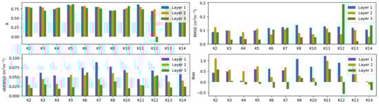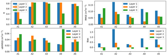 | Soil Layers | Land Cover Type | R | RMSE (m3·m−3) | UbRMSD (m3·m−3) | Bias | Number of Stations |