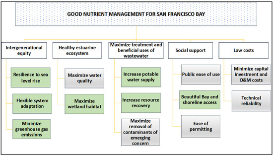 Objectives hierarchy for good nutrient management for San Francisco Bay were derived from interviews with 32 stakeholders. Objectives are color-coded by overarching categories (white background) Objectives that are characteristic of traditional wastewater infrastructure upgrades have a grey background and objectives that are indicative of a new paradigm for multi-benefit wastewater treatment have a green background. Reasons for the categorization are explained in the text.