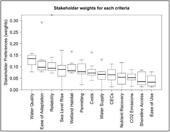 The nine stakeholders who participated in the follow-up interview had differing opinions about the relative importance of each goal to decision-making about nutrient management (Figure 2). It is notable that many less-traditional goals for nutrient management (like the provision of a wetland habitat increased resource recovery and increased shoreline access) were important to most stakeholders. There was wide variation in the importance of incorporating resilience to a sea level rise in decision-making with some stakeholders listing it as the most important criteria and others assessing it of no importance (for specific point values assigned to criteria, see Supplemental Information, Figure S1, and for individual stakeholder opinions for criteria, see Figure S2).
