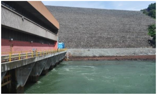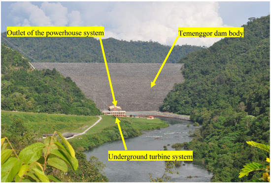 The Temenggor dam is a rock-fill dam located in a narrow valley in Sungai Perak about 200 km northeast of Ipoh, Gerik, Perak, Malaysia. The surface power station of Temenggor dam contains four vertical Francis turbines with a 348 MW installed capacity, with a separated surface powerhouse [46]. The 3D evaluation of the dam behavior under dynamic loading is crucial. Table 1 and Figure 1 and Figure 2 outline the important information pertaining to the Temenggor dam, which was crucial for the construction of a 3D FE model.