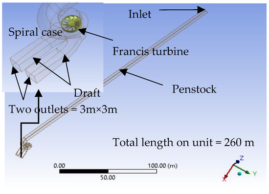 Jošt and Lipej built a three-dimensional (3D) numerical model for a Francis turbine unit to predict the vortex rope in the draft tube based on numerical flow analyses by performing two analyses, both with and without cavitation effects [8]. Another study reported a numerical analysis of the cavitation turbulent flow in a Francis turbine under partial load operation using the k–ω shear stress transport turbulence model in the Reynolds-averaged Navier-Stokes equations [9]. Qian et al. simulated 3D multiphase flows in a Francis turbine to calculate pressure pulsation in the spiral casing, draft tube, runner front, and guide vanes using fast Fourier transform [10]. Anup et al. investigated the hydrodynamic effects of pressure fluctuation in the draft [11]. The cause of rotor-stator interaction simulation under partial load operation, using analyzing 3D transient state turbulence flow simulation in a Francis tube, was investigated. The 3D Navier-Stokes computational fluid dynamics (CFD) solver ANSYS-CFX was used to analyze the flow through a vertical Francis turbine with different loads in situ. Most lately, Luna-Ramírez et al. calculated the pressure on the blades of a 200 MW Francis hydraulic turbine to locate the failure on the blade surface based on CFD [12]. There are also several other studies analyzing the Francis turbine using the advantages of computational features [13,14,15,16].