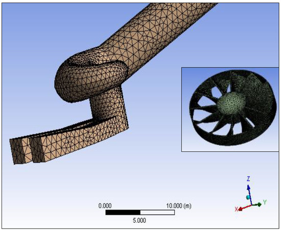 The 3D numerical model was run to find the pressure boundary pattern by inputting the boundary conditions including the inlet velocity for minimum and maximum upstream water levels, rotational speed of turbines listed in Table 3, outlet pressure (1 atmosphere), and the water properties. The turbine model was built in ANSYS-CFX and it is based on the finite volume technique. The flow simulation of the Francis turbine was employed by using several meshes to test the grid independence; it converged after many iterations. The grid independence of the turbine was created by using tetrahedral elements after performing several trials to determine the smallest possible aspect ratio under 150 and the minimum orthogonal over 0.15, as recommended by ANSYS-CFX code. The tetrahedron mesh was used because of its fine adaptability and the complexity of the computational domain. To obtain the required pressure fluctuation, the final mesh satisfied y+ < 200 around the boundary wall, which is in agreement with the previous research conducted by Liu et al. [48]. The runner, guide vanes, and draft tube interactions were counted using slip meshes. This slipping of meshes were toured around each other in the interface sides. However, it was important to ensure that the velocity components, pressure, and flow flux were harmonious after interpolation.