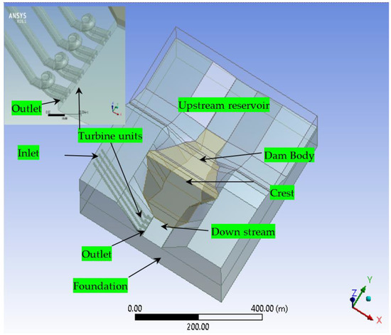 Caishui studied the pressure distribution in the flow pattern within a powerhouse using the fluid dynamics method [17]. Caishui developed a mathematical model for a specific powerhouse station to find the velocity distribution and the pressure pattern distribution under three operating conditions (one-unit load, two-unit load, and full load rejection). The results of the study showed a good flow pattern at the inlet with steady water level fluctuation. Wel and Zhang created a 3D numerical model for a powerhouse body using ANSYS software to determine the stress and strain in the powerhouse body, and pressure, acceleration, and the frequency within the powerhouse [18]. ANSYS software is an American engineering solution based in Canonsburg, Pennsylvania. They concluded that most vibration was generated because of the static and dynamic disturbance of the hydraulic turbine blades.