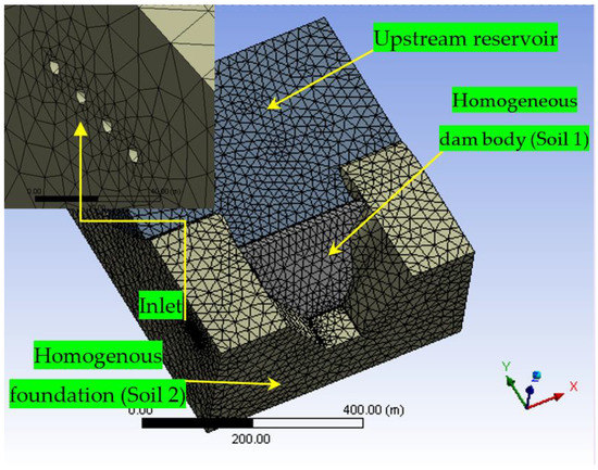 Table 4 shows the computational domain for the Temenggor Francis turbine model, which includes the 12 runner blades with the shaft, the Penstock, and the draft tubes. The total number of elements for the turbine model in the domain was 2.57 × 106, whereas the computational domain for the Temenggor dam model included a foundation of 127 m, upstream reservoir, with the concrete part including the spillway and the holes that represent the powerhouse region and the left and right embankments. The total number of cells for the turbine model in the domain was 1.93 × 106.