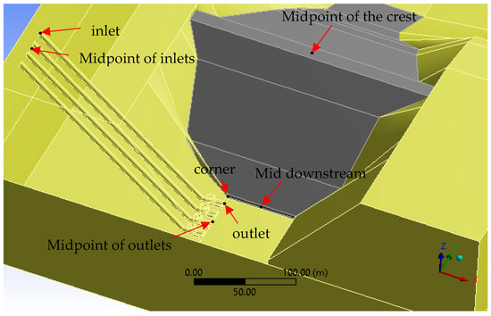 Figure 13 outlines the selected points for measuring the principle stress on the dam-reservoir-foundation system with a minimum water level with the effect of the four turbine units. The framework included two models: The Temenggor and Francis turbine model. ANSYS-CFX was used to model the transformation of the pressure to the dam model. ANSYS static structural facilities were used to convert the pressure from the turbine units to the common area between the dam and powerhouse for the purpose of simulating the principal stresses at selected locations (nodes) in the dam body. The modeling framework included 32 runs, in which 16 runs were performed with maximum water level in the reservoir and the other 16 runs were performed with minimum water level in the reservoir. These runs covered all possibilities of turbine operation. Figure 14 and Figure 15 outline the principle stress results in the selected nodes shown in Figure 13. Table 7 and Table 8 summarize the statistical analysis of the principle stress results.