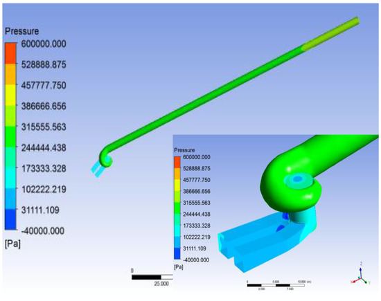The boundary pressure distribution in the Temenggor Francis turbine units is shown in Figure 11. It represents the case when the turbine runs under the flood upstream water levels. The results show that pressure distribution is proportional to the inverse of the velocity values based on the energy equation. However, the drop in pressure that occurs in the turbine shaft was more than the cavitation pressure. The pressure distribution and velocity flow lines are similar to those previously obtained [49,50].