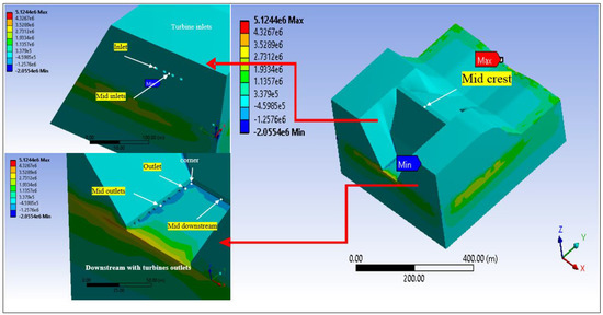 Figure 4 outlines the connection between the ANSYS-CFX solution and static structural setup, which was used to import the boundary pressure pattern results of running turbine model to the common area between the dam body and turbine units. By running the dam connected with turbines framework, with respect to the minimum and maximum upstream water levels, we considered all running possibilities (single, two, three, or four units). As such, the best powerhouse operations were allocated due to the minimization of the principle stresses at the selected points in the dam body and turbine units (Figure 8). The modelling procedure was applied, and the obtained results were compared with the related corresponding results.