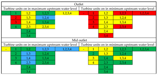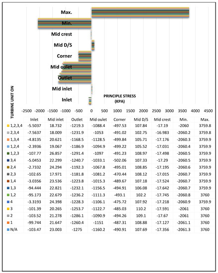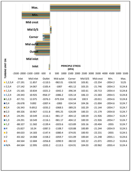 Figure 16 outlines a control program for the running turbines depending on the decrease in principle stress values in the selected points according to the classification listed in Table 7. There were 32 total operation scenarios, with 16 operation scenarios based on maximum reservoir water level, and the other 16 operation scenarios were based on minimum reservoir water level.