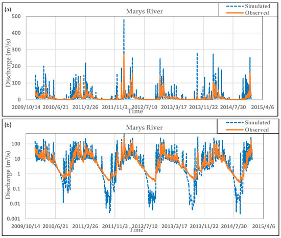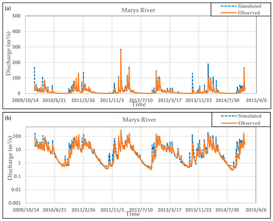 (a) Manually calibrated daily Soil and Watershed Assessment Tool (SWAT) discharge simulations compared with observations (2010–2014) from the United State Geological Survey (USGS) (14171000) Philomath flow gage. (b) Uses a log scale to emphasize low-flow conditions.