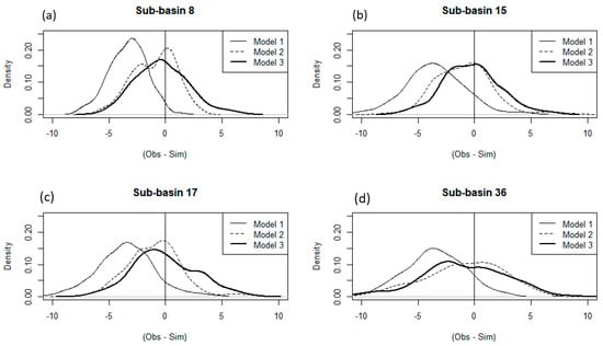 Kernel density estimates for the differences between observed and simulated stream temperatures as calculated using the three models for four sub-basins (a–d). The vertical line at zero indicates simulations that exactly match the observed data.