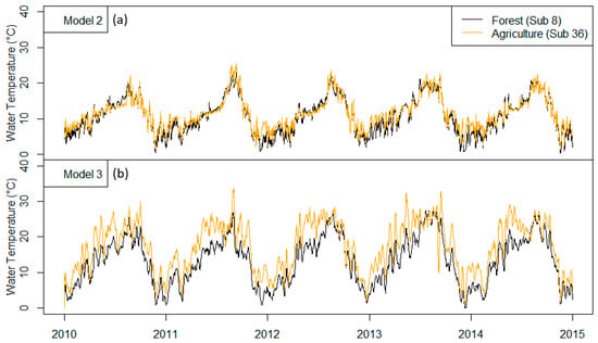 We now compare Models 2 and 3 to demonstrate that the incorporation of radiative components is able to simulate the influence of land use and land cover on stream temperatures (e.g., forested vs. agricultural regions). Stream temperature simulations for two sub-basins—a forested area (sub-basin 8) and an area dominated by agriculture with low vegetation (sub-basin 36)—are shown in Figure 5.