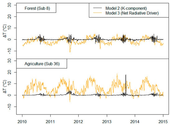 Overall, Model 3 may be useful for simulating the watershed-scale impacts of land use conversion from forest to agriculture on stream temperatures; however, model improvement—potentially through improved calibration—is needed to better match observed data. In addition, while Model 3 is able to simulate impacts of land use on stream temperature, this advantage is produced with the trade-off that radiative components exhibit much higher variability, and this noisy fluctuation (which can be seen directly from Figure 5, Figure 6 and Figure 7) further decreases RMSE values (Table 3).