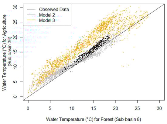 The mean (standard deviation) differences between the stream temperature simulations for the forested sub-basin (8) and the agricultural sub-basin (36) were −0.68 °C (1.30 °C) and −4.1 °C (2.34 °C) for Models 2 and 3, respectively. These simulations can be compared with the difference between the observed data for the forested and agricultural sub-basins (8 and 36): −1.07 °C (0.63 °C). Note that Model 2 gives estimates that are closer to the observed values than Model 3; this is not surprising since the RMSE values for Model 2 were lower than the values for Model 3 (Table 3). However, Model 2 is symmetric about the 1:1 line shown in Figure 7 and does not capture the positive bias of agricultural stream temperatures that is shown by the observed values as well as in the simulated values of Model 3. Model 3 captures the increases in stream temperature associated with the lack of forest cover in the agricultural sub-basin, yet Model 3 overpredicts this effect, and the variation in the simulated values are much greater than Model 2 or the observed data.