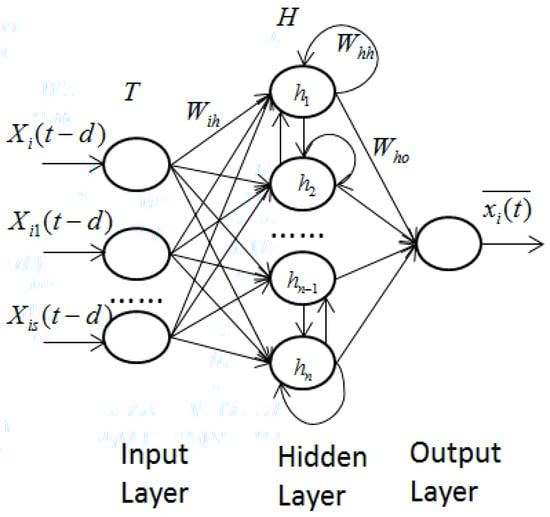 LSTM was proposed by Hochreiter and Schmidhuber in 1997 []. It is a new kind of RNN, which is faster and easier to converge to the optimal solution than other traditional neural networks when dealing with time sequence prediction problems. A water quality prediction model based on LSTM is established in Figure 1. The inputs are observations of and at previous historical moments denoted as . The output is the prediction value of at the tth moment denoted as . The model consists of three layers: the input layer, the hidden layer, and the output layer. The weight between the input layer and the hidden layer is represented as . The neurons of the hidden layer are denoted as , where the jth neuron of the hidden layer is expressed as . The weight within the hidden layer is denoted as . The weight between the hidden layer and output layer is represented as .