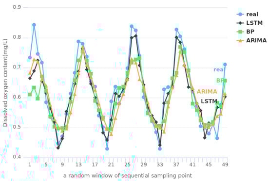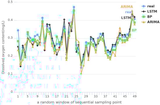 The prediction results in a random window of sequential sampling points from the test data set are shown in Figure 4 and Figure 5. According to these, the results of LSTM are closer to the real observations. It indicates that the prediction model based on LSTM is more accurate than other models based on BP or ARIMA. The RMSE for the entire test data set is shown in Figure 6. According to the Figure 6, the RMSE of LSTM is lower than that of BP and ARIMA in Tai Lake and Victoria Bay. It suggests that LSTM can fully take advantage of the time sequence of water quality information, which is effective for improving the accuracy of prediction.