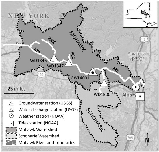 The map shows the location of the weather station, the USGS groundwater station (GWL4001), the two USGS water discharge stations (WD1346 and WD1347) located at the Mohawk River (MR) area of the Mohawk watershed, the third station (WD1500) located at the Schoharie Creek (S) of the Schoharie watershed, and the station of the tides in Albany, NY (ECC—East Canada Creek; MR—Mohawk River; S—Schoharie Creek; WCC—West Canada Creek; NOAA—National Oceanic and Atmospheric Administration; USGS—United States Geological Survey). The geographic information system (GIS) map was composed in ArcMap utilizing data from the New York State clearinghouse and the New York geographic information gateway.