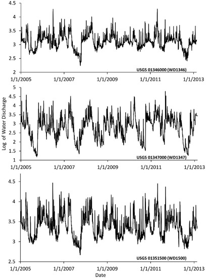 The logarithmic water discharge time series of the USGS stations WD1346 (USGS 01346000), WD1347 (USGS 01347000), and WD1500 (USGS 01351500) measured from 1 January 2005 to 23 February 2013.