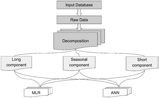 The flowchart shows the hybrid model that consists of the data processing and the integration of the decomposition into the multiple linear regression (MLR) or artificial neural network (ANN) application.