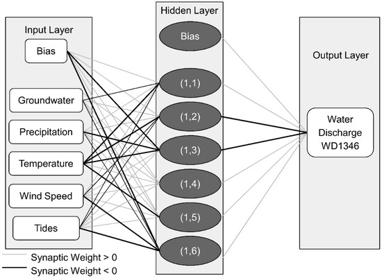 The feedforward artificial neural network of the raw data from the USGS station WD1346 using a hidden layer transfer function of hyperbolic tangent and an output layer for the prediction of water discharge.