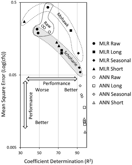 MSE has also been plotted as a function of the coefficient of determination, R2 (Figure 6). Using the ANN model in the decomposed data (long-, seasonal-, and short-term), a lower MSE and higher R2 has been achieved compared with the MLR model. Figure 6 also reveals a linear pattern between the MSE and the coefficient of determination for each of the component for both models (MLR and ANN), while there is no pattern between the measures for the raw data. This pattern of the forecasting accuracy (lower MSE) has been achieved when the frequencies on the data have been separated (long, seasonal, and short-term component). Figure 6, also shows a different pattern between the MSE and the coefficient of determination for the two different watersheds (Mohawk River and Schoharie Creek). It is reasonable to assume that the accuracy of the model depends on the watershed of the river for the MLR model. This plot can be used to identify different watersheds based on the measures of goodness of fit (MSE and R2) for the MLR model. However, such an interpretation was not apparent in the ANN model.