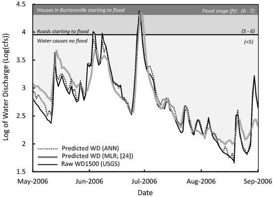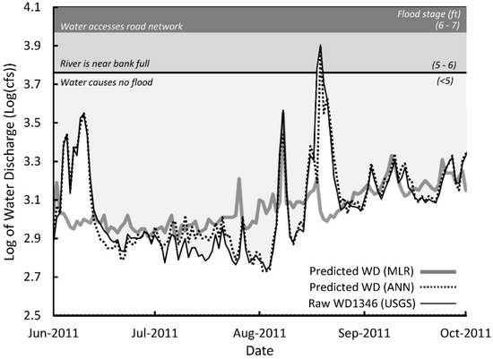 A graphical representation of the overall MLR and ANN model can be used to compare the raw and the predicted values of the water discharge time series in all the stations. Following the process, Figure 7 shows the flooding event during the Irene storm (21 August to 28 August 2011) in West Canada Creek at near Herkimer (Mohawk Watershed). Using the ANN model, the predicted values perform well compared with the raw data. With the MLR model, some of the flood events may be predicted but with not such high forecasting accuracy. A similar plot can be derived for the station WD1500 (Figure 8) which shows the impact of the Mid-Atlantic United States flood of 2006 (25 June to 5 July 2006) at Schoharie Creek, New York. The predicted values of the water discharge using the ANN model achieve all the flood events and perform well compared with the raw data. Previous studies have shown that separating the data into summer and winter periods may increase the performance of the MLR model [14]. This plot shows the MLR model derived from only the summer period of 2005. The flooding events may be predicted as a good fit, but they do not provide as high a performance as the ANN model. In this study, we do not separate the data in summer and winter periods as the ANN model provides the maximum performance in the predicted values without separating the data in different periods of the year.