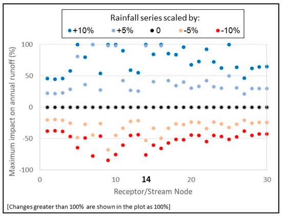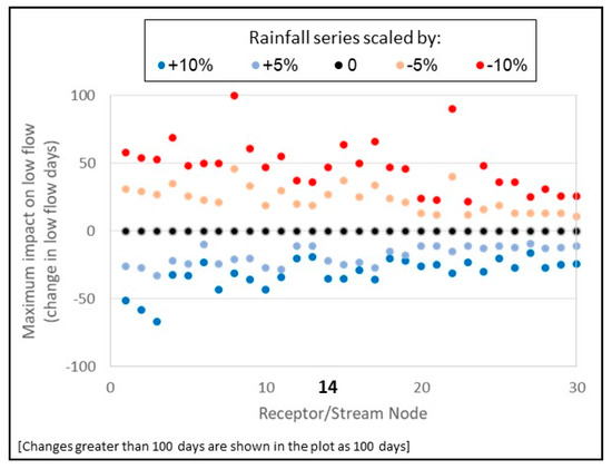 The sensitivity of runoff to future climates is simplistically explored here by scaling the 2013–2102 rainfall series used in the modelling above. The entire 90 years of daily rainfall is scaled by the same factor. Scaling factors of −10%, −5%, +5% and +10% are used. The results for annual runoff and for low flow are presented in Figure 5 and Figure 6, respectively. The plots show the maximum change in the streamflow characteristics (as defined above) for the scaled rainfall series (reflecting plausible changes in future mean annual rainfall) relative to the original 2013–2102 rainfall series with no mining development. As expected, the percentage change in rainfall is amplified as a bigger percentage change in runoff [12,13]. The 5% scaling led to a maximum annual runoff change of 20–30% at most receptor or stream nodes, and the 10% scaling led to a maximum annual runoff change of more than 50% at most nodes (Figure 5), much greater than the ACRD (proposed coal mine development) maximum annual runoff impact of 11% at Node 14 and close to zero elsewhere (Figure 3). For low flow, the −5% scaling led to a maximum change of 10–30 more low flow days (number of days when daily runoff is below the fifth percentile value) at most nodes, and the −10% scaling led to a maximum change of 30–50 more low flow days at most nodes (Figure 6), also significantly greater than the ACRD maximum low flow impact of nine days at Node 14 and close to zero elsewhere (Figure 4).