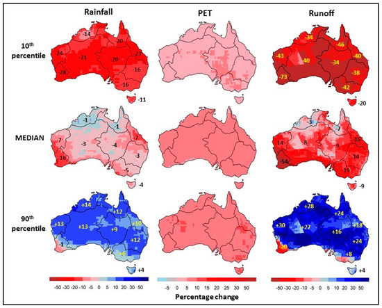 Projected percentage change in mean annual rainfall, potential evapotranspiration (PET) and runoff (median and the 10th and 90th percentile values from hydrological modelling informed by projections from the 42 CMIP5 global climate models) for dRCP8.5 for 2046–2075 relative to 1976–2005 (adapted from [14]).