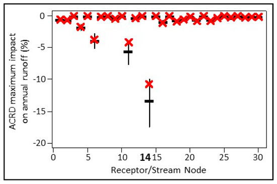 Distribution of ACRD maximum impact on annual runoff, modelled using 100 stochastic replicates (plots show median and 10th and 90th percentile values, the red crosses show results when the 1923–2012 rainfall sequence is used (as in Figure 3).