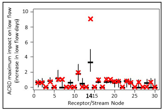 Distribution of ACRD maximum impact on low flow days, modelled using 100 stochastic replicates (plots show median and 10th and 90th percentile values, the red crosses show results when the 1923–2012 rainfall sequence is used (as in Figure 4).