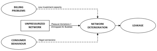 The more the network is degraded, the more there is room for leakage, and the more water is lost [62]. However, it should also be noted that intermittency makes it more difficult to detect leaks in general, whether they are its direct consequence or not [5], because the usual leak detection techniques (fixed and mobile pre-localization, acoustic detection, etc.) require a pressurized network, with the exception of Helium detection (tracer gas). And even in the latter, the repair cannot be validated on the spot due to the absence of pressure. This problem was noted in Amman in particular, where leaks that were supposed to be repaired reappeared once the network was put back under pressure. Figure 5 illustrates some factors generating or aggravating network deterioration and leakage under intermittency.