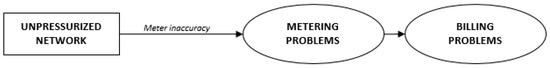Intermittency induces an interruption of service, usually associated with cycles of water filling and emptying of the pipes, and the expulsion of the air that was entrapped in the network. These conditions cause metering malfunctions readings [44,45] due to the following reasons: