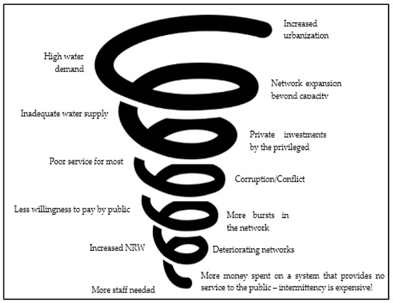 Water and energy scarcity, population density increase, and the dynamics of urban expansion in one side, combined with failures in governance and the lack of adequate planning and structural adaptation, in developing cities, make the task of providing basic urban services more complex [38,39]. It is generally a combination of several of these factors, sometimes with a contribution of the population’s attitude towards water, that set intermittency off [7,40].