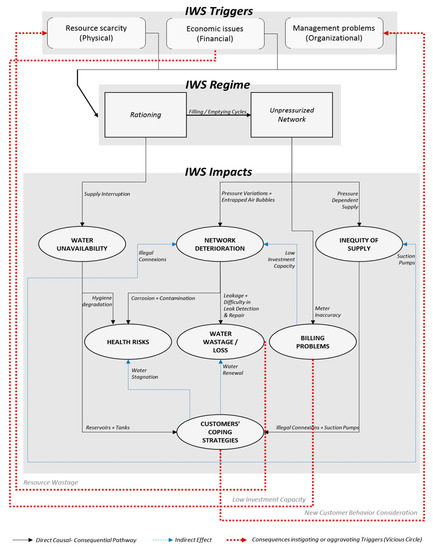 Intermittency is a relatively logical perpetuation of the current climatic, demographic and environmental conjecture, usually associated with organizational dysfunctions with multilevel contributions. There is a strong connection between the causes of intermittency and the problems associated with it. These relationships are globally reflected in a deterioration in the state of the system and in the quality of drinking water delivery service, leading to a worsening of the triggering factors, and an ingress into a characteristic vicious circle. However, the impairment can be scaled according to the inconvenience incurred.