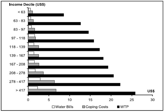 - Baisa, B.; Davis, L.W.; Salant, S.W.; Wilcox, W. The welfare costs of unreliable water service. J. Dev. Econ. 2010, 92, 1–12. [Google Scholar] [CrossRef]