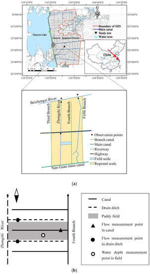 Location of the Gaoyou Irrigation District (GID) and layout of the field-scale- and regional-scale experimental areas (partly adopted from (Xiong et al., 2015) [29]). (a) Layout of experimental area; (b) Layout of the field-scale experimental area.